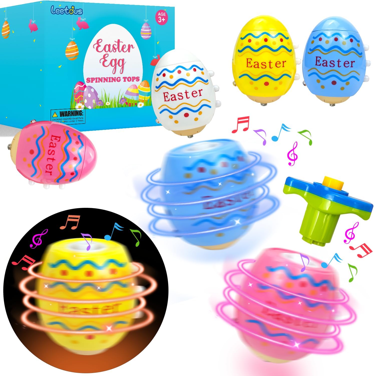 $17 BUY ON AMAZON: Leetous Easter Egg Basket Stuffers Toys Gifts for Toddler Boys Girls, 4 Pack Light up Spinning Tops with Music