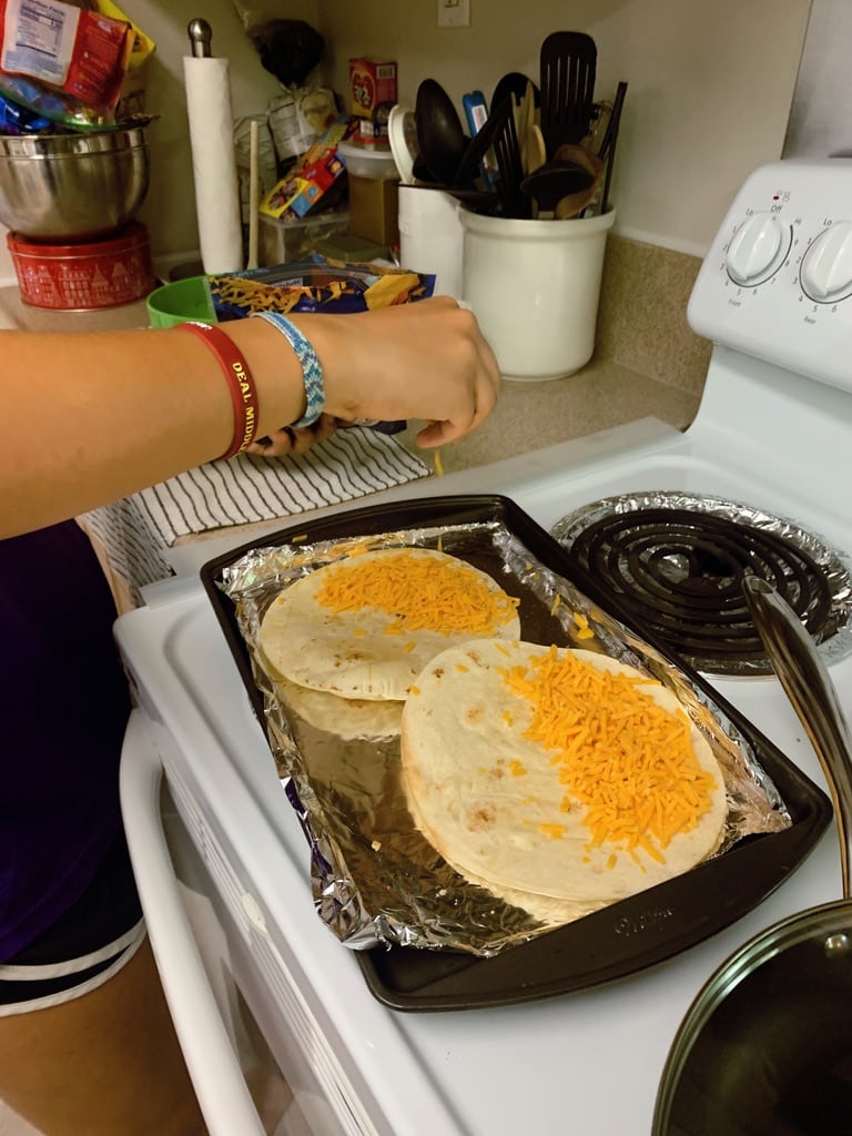 - Place 2 handfuls of cheese or whatever desired amount you would like upon each tortilla