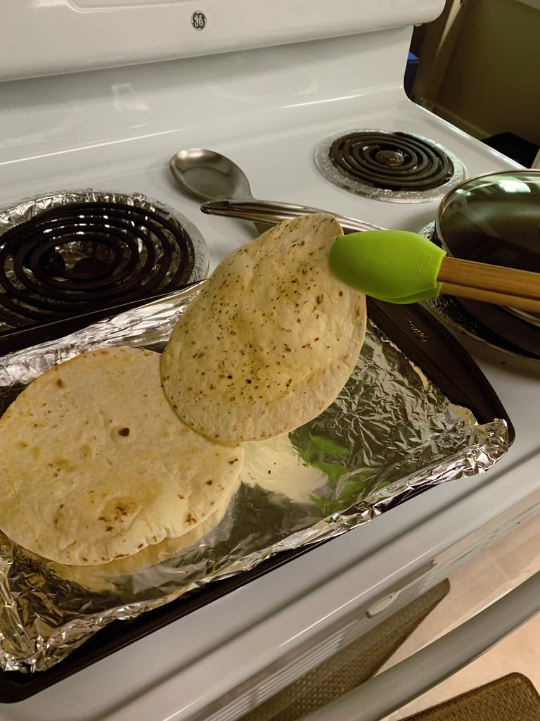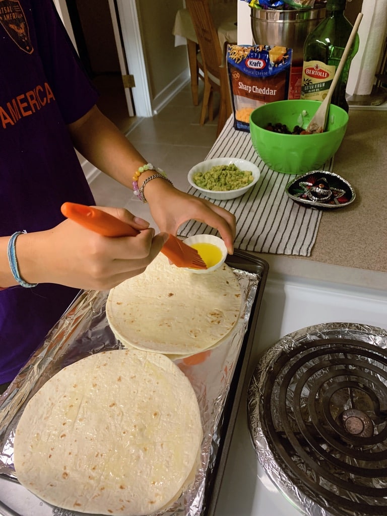 - Place the tortillas onto the sheet pan once ready; with this put olive oil in small bowl or container and use silicone brush to brush over both sides of the tortilla (I also like to garnish the oiled tortillas with some sort of seasoning; I use oregano)