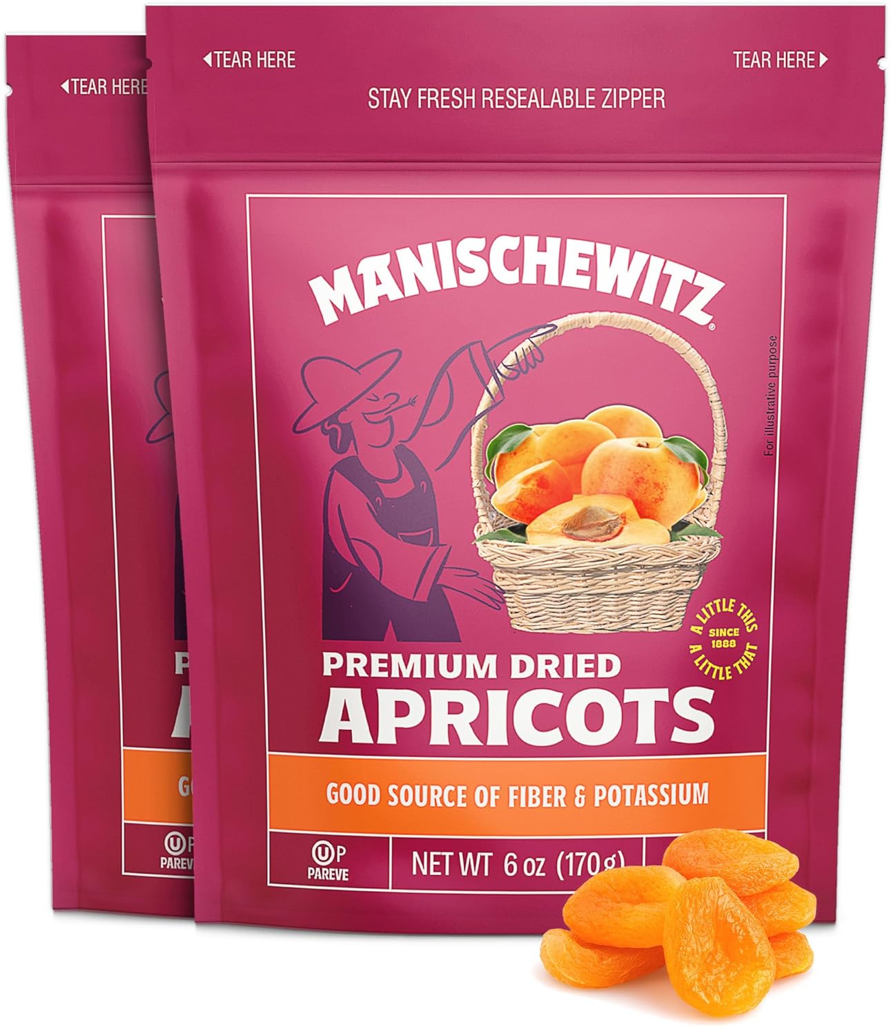 Manischewitz Premium Dried Apricots are gluten-free, no sugar added, and Kosher for Passover. If you’re making a fruit platter, these are a great choice. These 6 oz bags are delivered in a 2 pack bundle. A good source of fiber, it’s ideal to have as a snack if you’ve had too much Matzo!